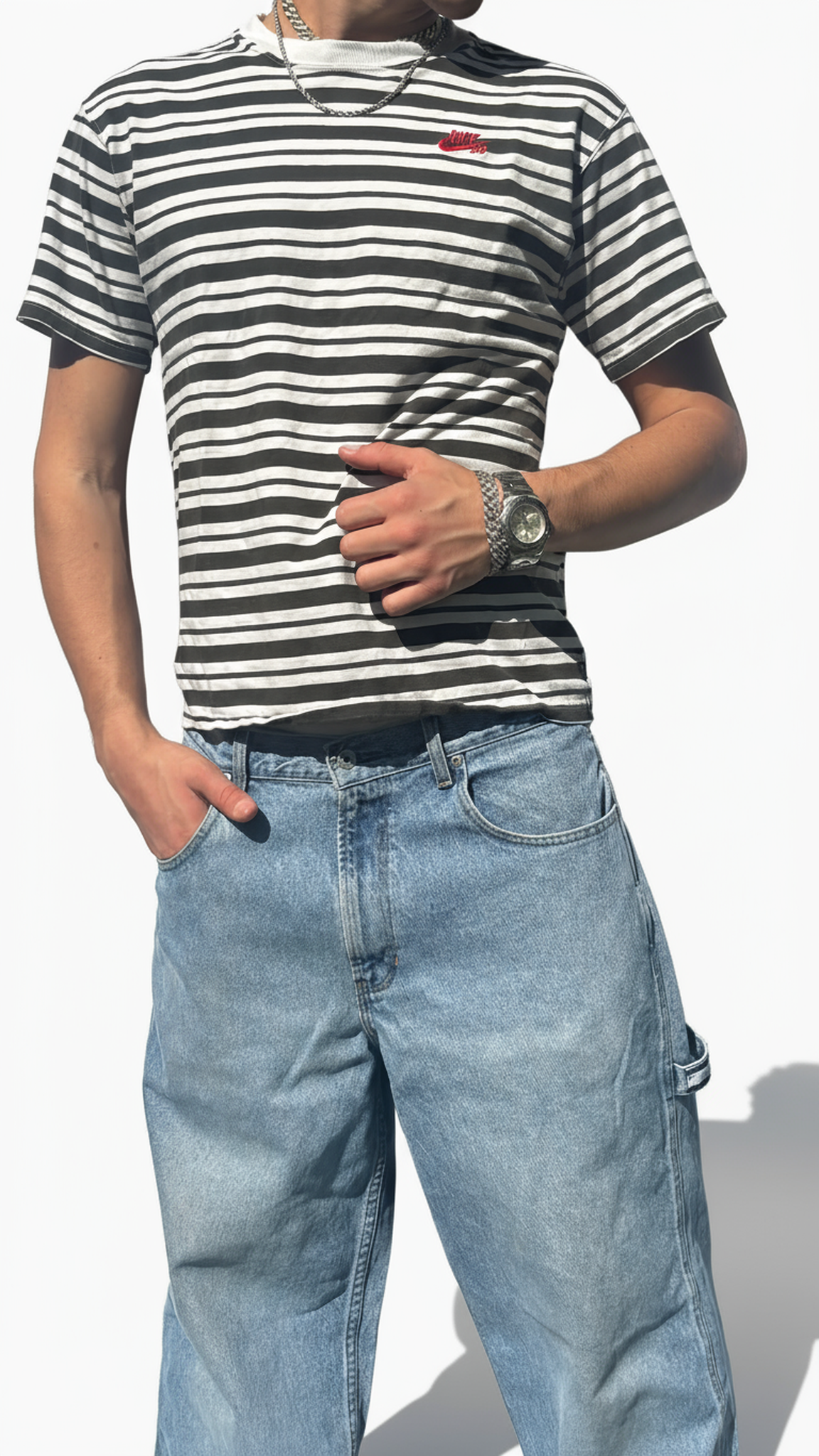 Maglietta Nike Sb Vintage nera e blu a righe -Stile skate e comfort quotidiano. Questa maglietta Nike SB a righe nere e blu unisce un design casual e moderno con la qualità tipica del brand. Perfetta per un look streetwear autentico e versatile.